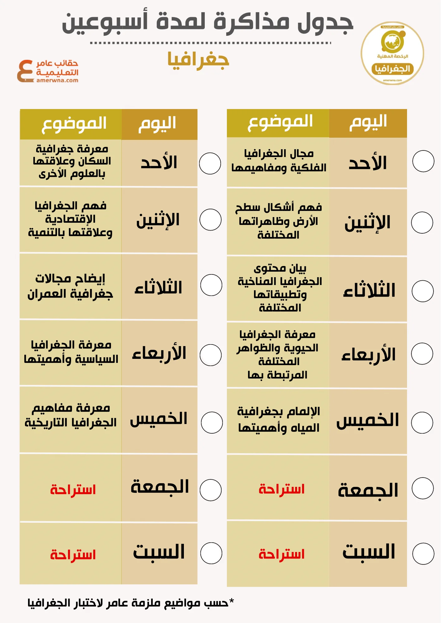 جدول مذاكرة الجغرافيا للرخصة المهنية من موقع اختبارات عامر التعليمية هو أداة ضرورية لكل من يستعد لاجتياز امتحان الرخصة المهنية الجغرافيا . يتميز هذا المنتج بتنظيم دقيق ومنهجية فعّالة تسهل على الطالب استيعاب المواد والمفاهيم الضرورية للامتحان. يحتوي الجدول على ترتيب يومي للمذاكرة يشمل مواضيع متنوعة تغطي جميع جوانب المنهج بطريقة منظمة ومنسقة.